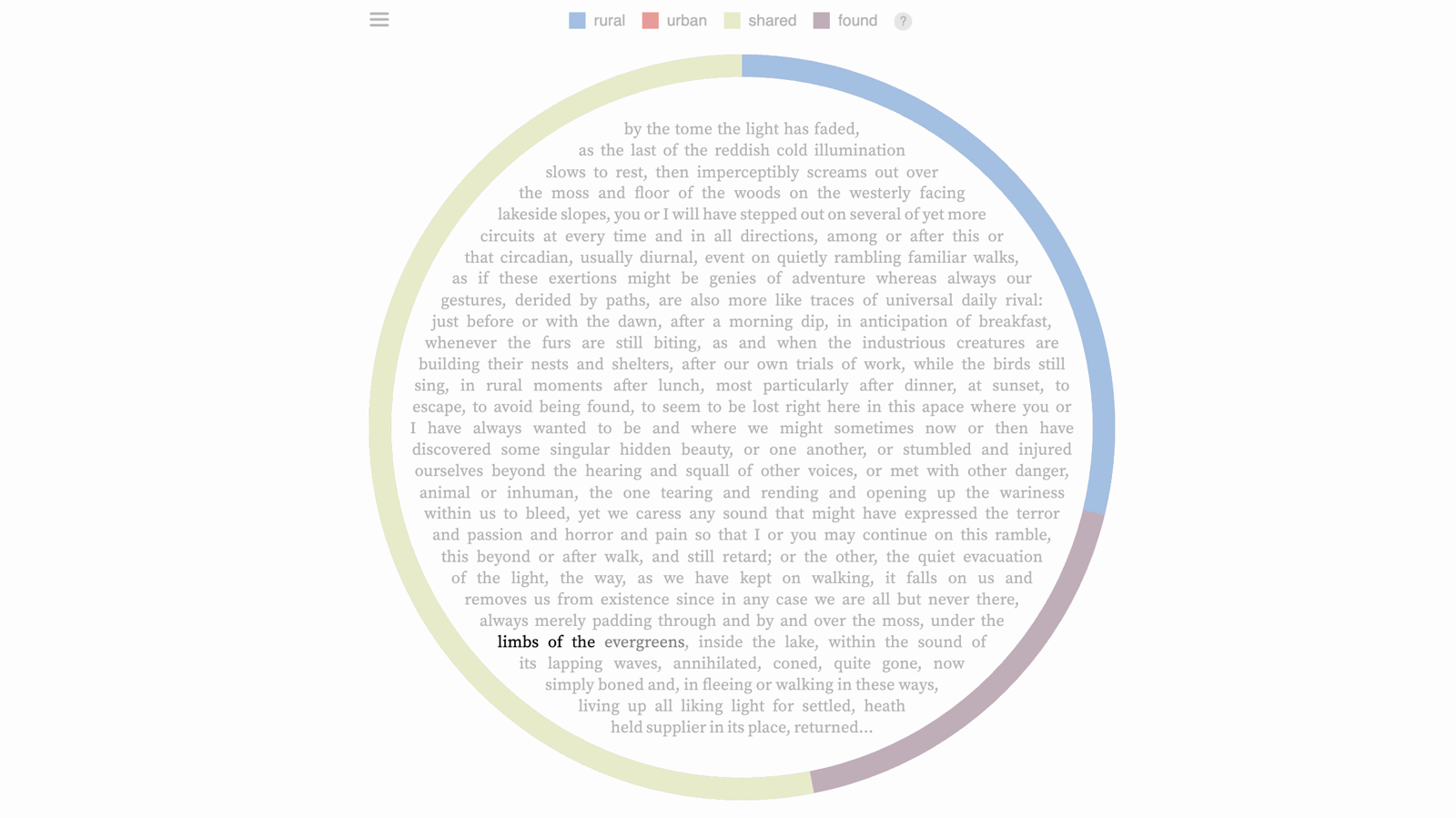 All the emphasized words – which some editions may set as small caps – in Henry James’ Preface to The Ambassadors presented within one minute, the intervening durations within each minute proportional to an average time taken to read the words between those emphasized. Looped animation.